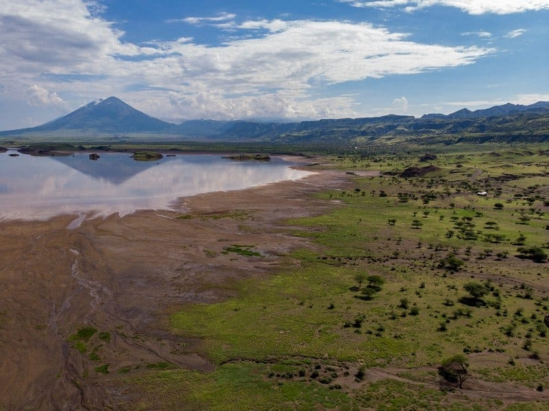 The ash and debris from past eruptions of Ol Doinyo Lengai washed down into the lake. Over time, evaporation has concentrated the salts and minerals in the lake, leading to its extreme alkalinity.