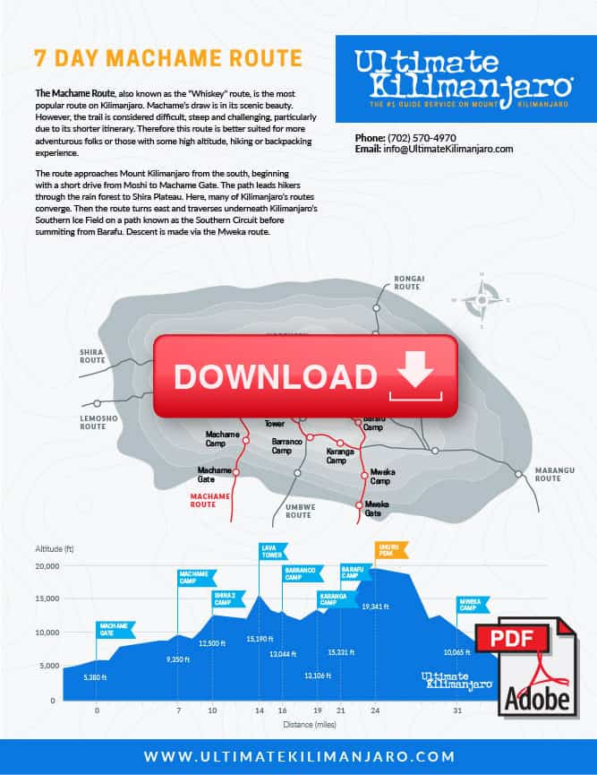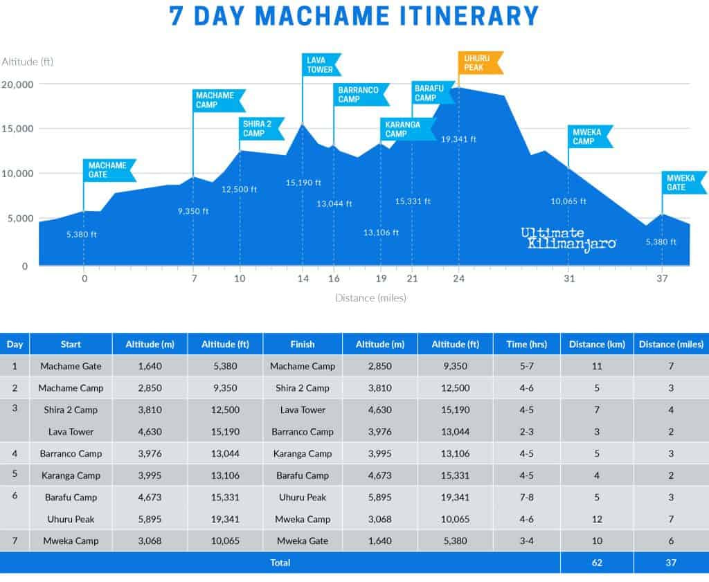 - The 7 day Machame route is the standard itinerary and is described in detail below.