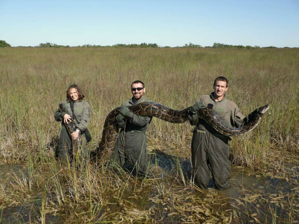 The Burmese python is one of the largest snakes in Asia, reaching lengths of about 23 feet (7 meters) and weighing around 200 pounds (90 kilograms). This snake, marked by bold patterns of brown and tan, inhabits forests, marshes, and riverbanks across Southeast Asia. As powerful constrictors, they prey on mammals and birds, wrapping their coils around them until they can no longer breathe. However, in regions like Florida, where they are an invasive species, Burmese pythons have severely impacted local wildlife, consuming native animals that have little defense against these large, non-native predators.