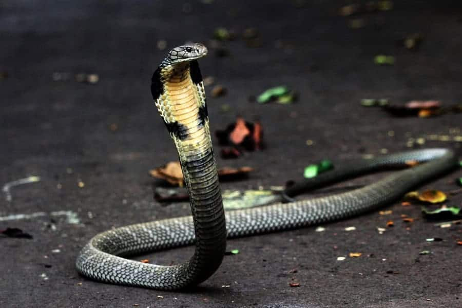 The king cobra is the world’s longest venomous snake, with adults often reaching lengths of 18 feet (5.5 meters). Found across the forests of Southeast Asia and the Indian subcontinent, this snake has an olive-brown coloration with a distinct hood it raises as a threat display. Unlike most large snakes, the king cobra preys almost exclusively on other snakes, including venomous species, displaying unique hunting behavior. Known for its lethal venom and ability to deliver large amounts in a single bite, the king cobra’s venom is potent enough to kill an elephant. Despite its deadly nature, it is generally wary of humans, using its hooded display to scare rather than attack.
