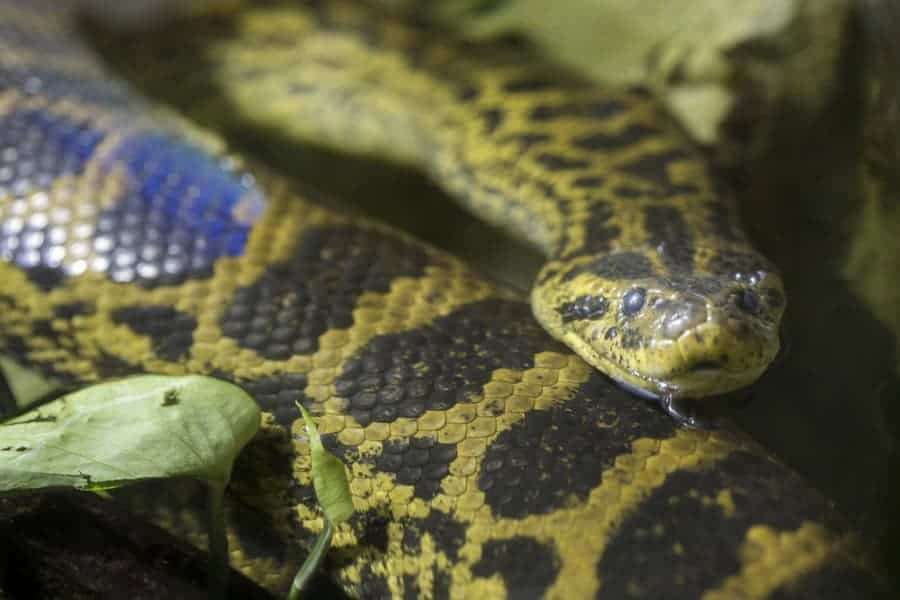 The yellow anaconda, a close relative of the green anaconda, reaches lengths of about 13 feet (4 meters) and weighs approximately 120 pounds (54 kilograms). This snake is native to Paraguay, Uruguay, and Bolivia, where it inhabits marshes, rivers, and swamps. Its yellow-green coloration, marked with black spots and patches, allows it to camouflage in murky water. Unlike its larger cousin, the yellow anaconda has a more restricted diet, feeding primarily on birds, fish, and small mammals.