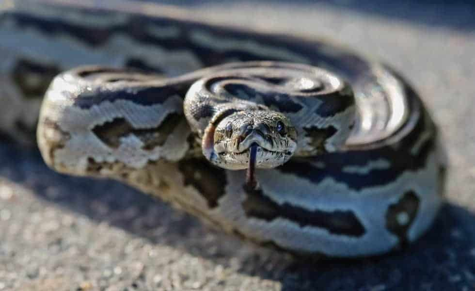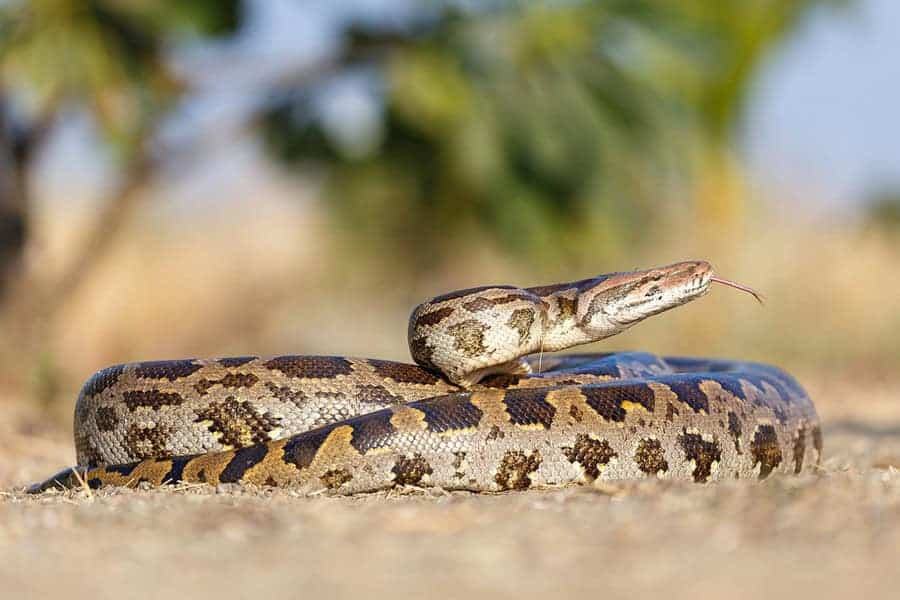 The Indian python, closely related to the Burmese python, reaches lengths around 20 feet (6 meters) and weighs up to 150 pounds (68 kilograms). Found across the Indian subcontinent, these pythons inhabit forests, grasslands, and wetlands. Their distinctive light and dark brown pattern provides effective camouflage, helping them ambush prey like rodents, birds, and occasionally deer. The Indian python is revered in local cultures, sometimes seen as a symbol of endurance and strength. Despite their size, these pythons are often docile around humans.