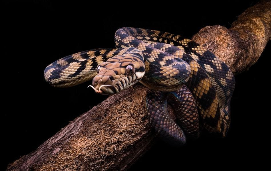 Also known as the scrub python, the Amethystine python is native to Indonesia, Papua New Guinea, and Australia, typically reaching up to 20 feet (6 meters). Most average around 16 feet (4.9 meters) in length, with a glossy, iridescent sheen on their scales that gives them a striking appearance. These pythons inhabit rainforests and tree-filled landscapes, where they are adept climbers. Feeding on birds, bats, and small mammals, they strike quickly from tree branches or dense foliage.