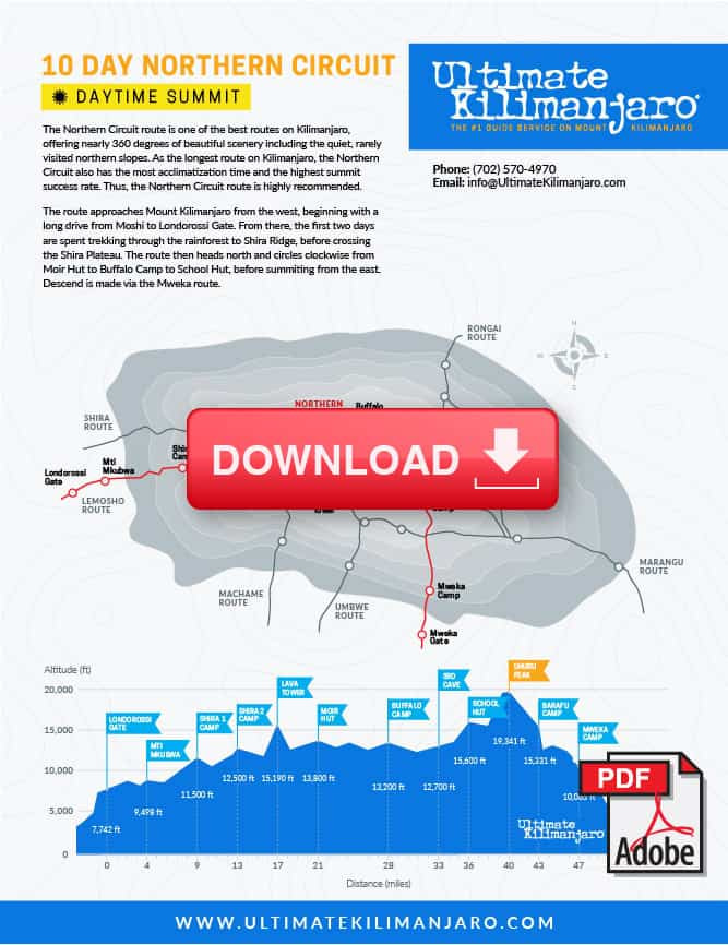 The 10 day Northern Circuit “daytime summit” route is a variation of the standard 9 day Northern Circuit route with the following change: it shortens the summit day by beginning the summit bid in the daytime and descending and staying at Barafu Camp (instead of Mweka Camp). This variation eliminates the harsh midnight summit attempt, making the day less difficult, more scenic, and more comfortable.