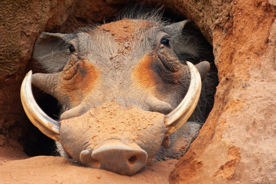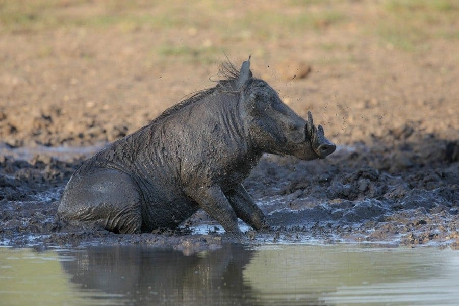 Warthogs often will roll in the mud, an activity that serves multiple functions. The first is for thermoregulation. The African savanna can reach sweltering temperatures, and the thick mud acts as a natural coolant. As the mud dries, it forms a layer over the skin, reflecting the sun’s rays and providing sustained relief. The mud also acts as a barrier against the sun, providing a natural sunscreen (warthog skin can sunburn). Lastly, mud aids in parasite control. When it dries and flakes off, it takes with it ticks, fleas, and other parasites that may have latched onto the warthog’s skin.