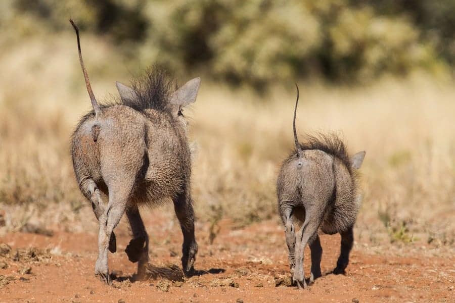 During flight from predators, warthogs exhibit a peculiar behaviour: they run with their tails standing straight up in the air. Biologists believe that the tail acts as a visual guide to keep family groups together during high-speed escapes through dense vegetation (they can sprint at speeds of up to 34 mph, or 55 km/hr). Additionally, their erect tails may confuse or distract predators.