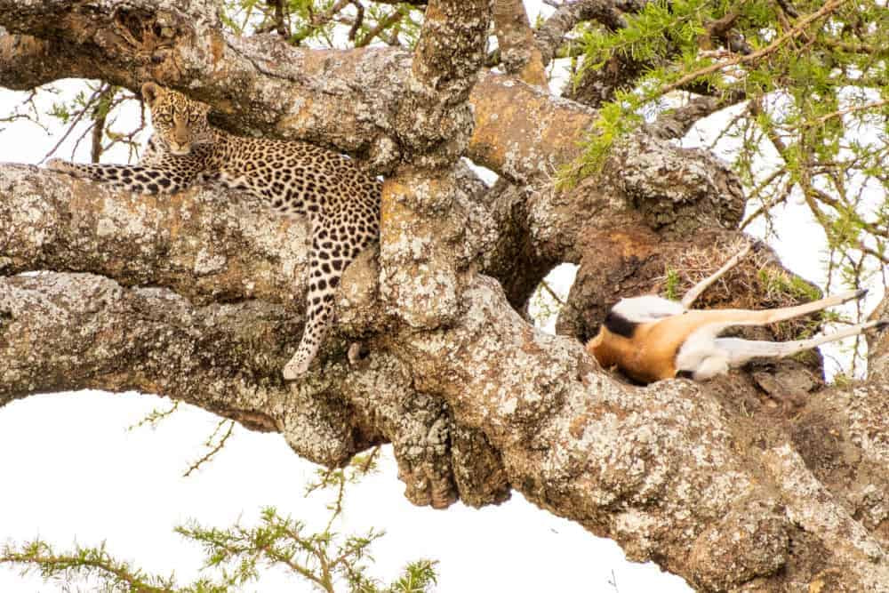It is not uncommon for a leopard to drag their kill 50 feet high into a tree. Their muscles make them excellent climbers along with their retractable claws.