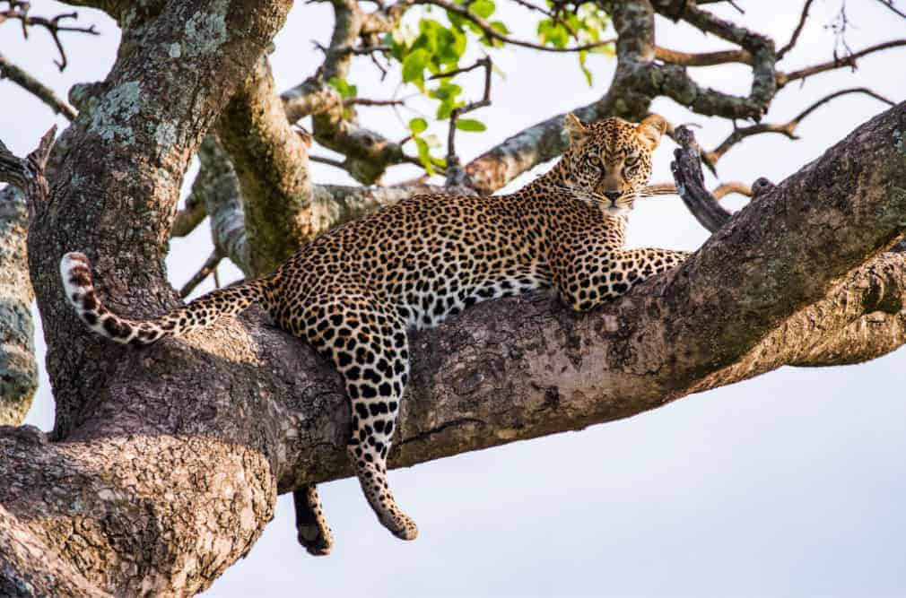 The leopard is a strong and agile climber who is often found resting on a tree branch during the day. After a kill, leopards will often stash their prey in a tree to prevent other animals such as hyenas and lions from stealing it, and they enjoy the meal for several days.