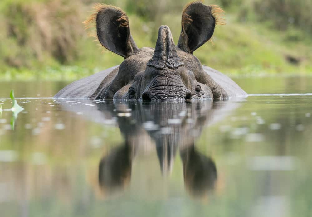 Despite their size, rhinos are not great swimmers. They are quite heavy and not built for swimming long distances. However, they can wade through shallow water if they need to cross a river or cool off, using their buoyant bodies to stay afloat.