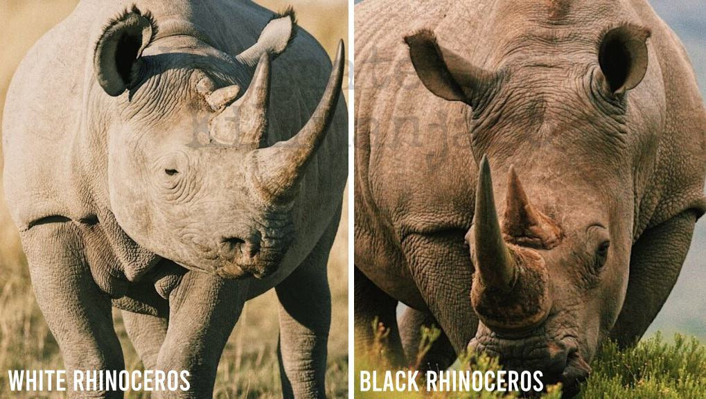 In Africa, the names of the two main types of rhinos can be a bit misleading because both are actually gray. The “white” rhino’s name comes from the Afrikaans word “wijde,” which means “wide,” describing its wide mouth. Black rhinos, on the other hand, have a pointed upper lip for grasping leaves and twigs from trees and bushes.