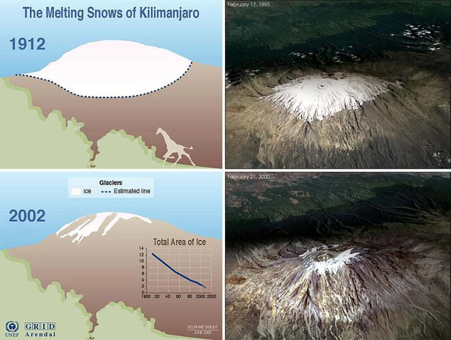 Kilimanjaro’s glaciers are the poster child of global climate change. It’s icecap has shrunk 82% since 1912. Scientists estimate the glaciers may be completely gone in 50 years. The cause of this is thought to be due to deforestation, and not necessary global warming.