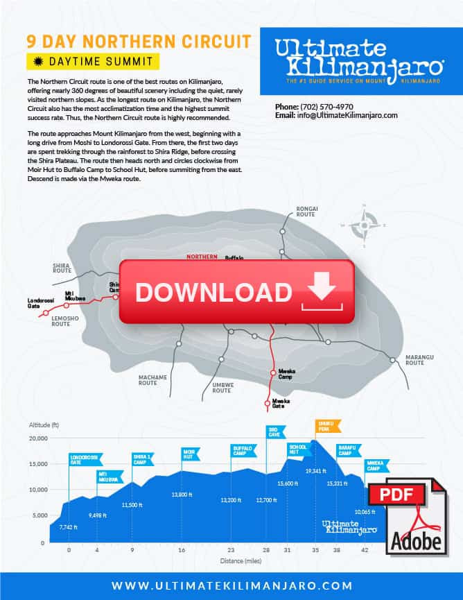 As the longest Kilimanjaro route, the Northern Circuit also has the most acclimatization time and the highest summit success rate. Thus, the Northern Circuit route is highly recommended.