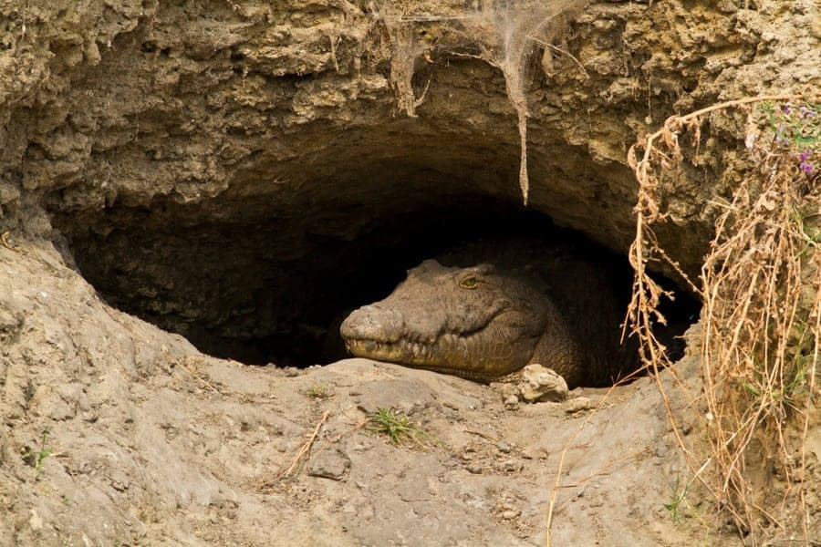 Crocodiles are well-adapted to their aquatic environments but are also equipped to handle periods of drought and low water levels. During these times, crocodiles can dig estivation pits or burrows. These are dug into riverbeds and mudbanks, where they can access cooler, moist substrates to reduce their body’s water loss. This behavior is a form of estivation, similar to hibernation but for hot and dry conditions. In these burrows, crocodiles slow down their metabolism, which reduces their need for food and water.