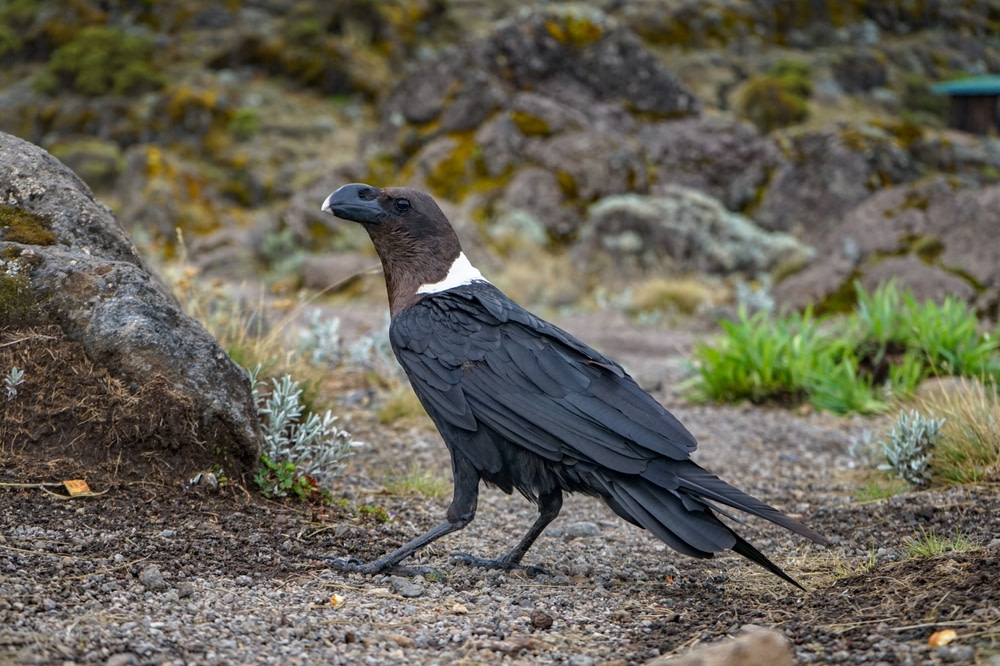 White-necked ravens have glossy black plumage with white nuchal collars at the back of their necks. They are found in mountainous areas in Southern and Eastern Africa. White-Necked Ravens are larger and more solitary birds. They are commonly seen gliding near or walking around Kilimanjaro campsites. You may also encounter it in hilly or mountainous zones of Ngorongoro Conservation Area.
