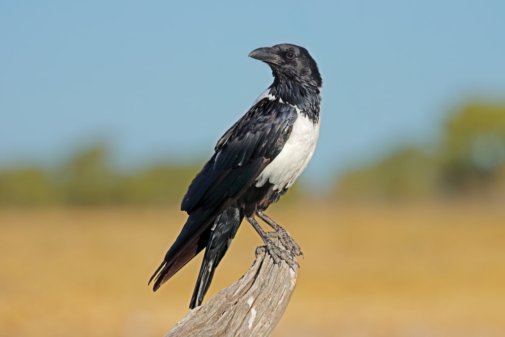 The Pied Crow has a white breast, neck and collar. It is a medium-sized crow that is widely distributed in Sub-Saharan Africa. In Tanzania, the Pied Crow can be seen throughout lower elevations including open areas, farmland and the outskirts of towns near human settlements. You might spot them near the starting points of Mount Kilimanjaro hikes. They also appear around major safari parks such as Serengeti, Tarangire, and Lake Manyara, where they scavenge on open plains.
