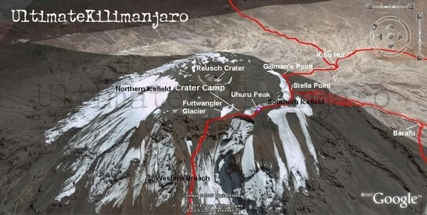 However there are special periods when the mountain receives an excessive amount of ice near the summit. The ice can form in places below the crater rim and around the summit – from Gilman’s Point (18,600 feet) and Stella Point (18,885 feet) up to Uhuru Point (19,340 feet).
