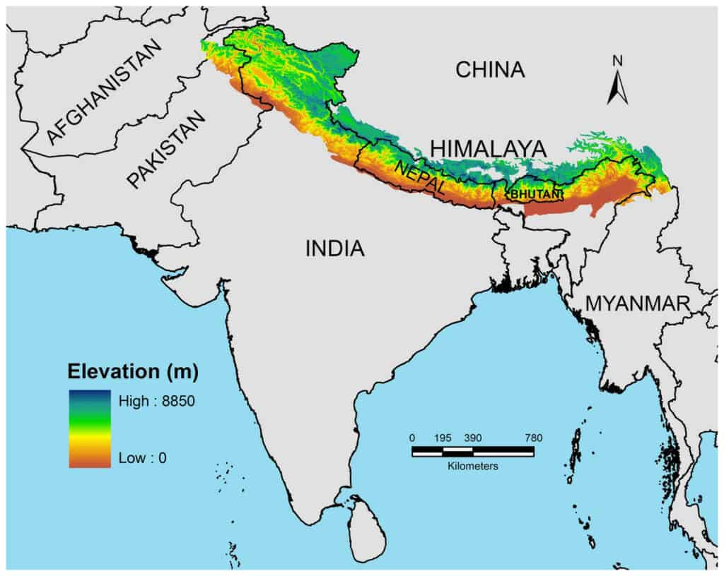 The Himalayas span across five countries: Bhutan, India, Nepal, China, and Pakistan. They form an crescent shape running east-west.