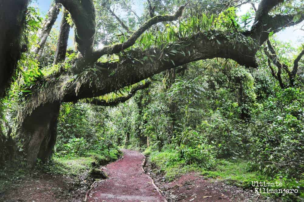 The journey begins in the beautiful rainforest at the base of Mount Kilimanjaro. The trail here consists mainly of volcanic soil, red clay, and exposed tree roots. This ecological zone gets an enormous amount of rainfall annually. So the path here is usually at least a little wet and muddy. This is why it is important to have proper hiking boots or shoes that have good tread.