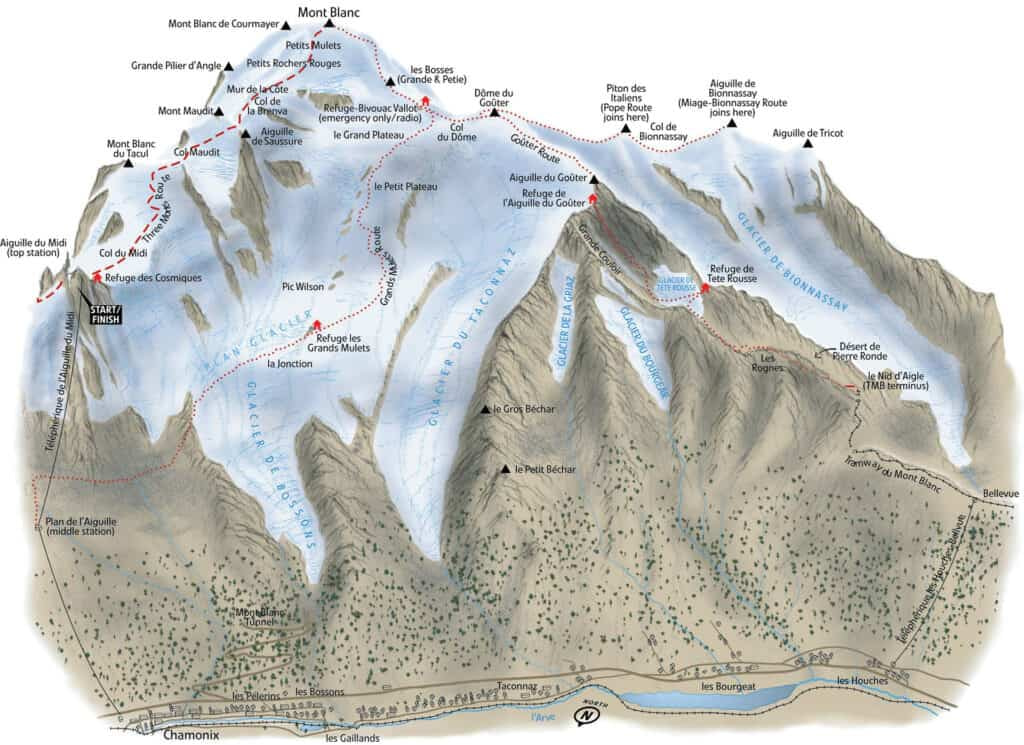 Mont Blanc offers several climbing routes, with the most popular being the Gouter Route followed by the Three Monts Route.