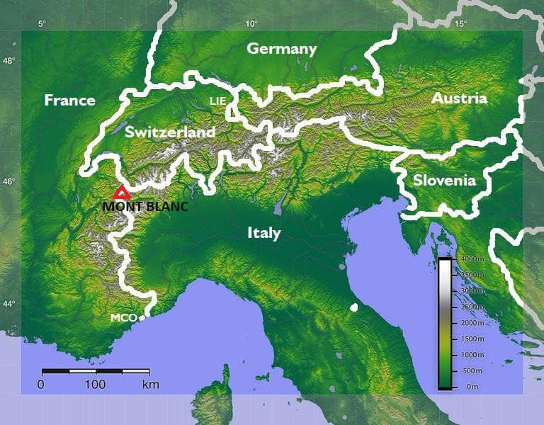 Mont Blanc is located on the border between France and Italy, in the Alps mountain range. The mountain itself is approximately 30 miles (48 kilometers) long and 10 miles (16 kilometers) wide. The Alps are Europe’s highest and most extensive mountain range, spanning across eight countries: France, Switzerland, Italy, Germany, Austria, Liechtenstein, Slovenia, and Monaco.