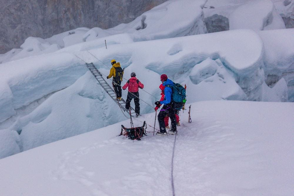 People often ask why helicopters aren’t used for rescue and recovery on Everest. The highest elevation that helicopters can reliably land is Camp 2, located at 21,000 feet (6,400 meters). The air density on the upper slopes mean that helicopters generally aren’t able to operate. Above a certain altitude, there are not enough air molecules for the rotors to create enough lift. The highest helicopter rescue ever on Everest was at 25,590 feet (7,800 meters) in 2013, done in calm weather conditions.