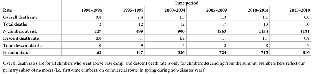 However the data indicates that overcrowding has not significantly impacted success or death rates. In 2019, 65.9% of summit attempts were made on two peak days, yet success and death rates on these days were comparable to less crowded days. Improved weather forecasting encourages climbers to choose the safest days, mitigating the risks posed by crowding.
