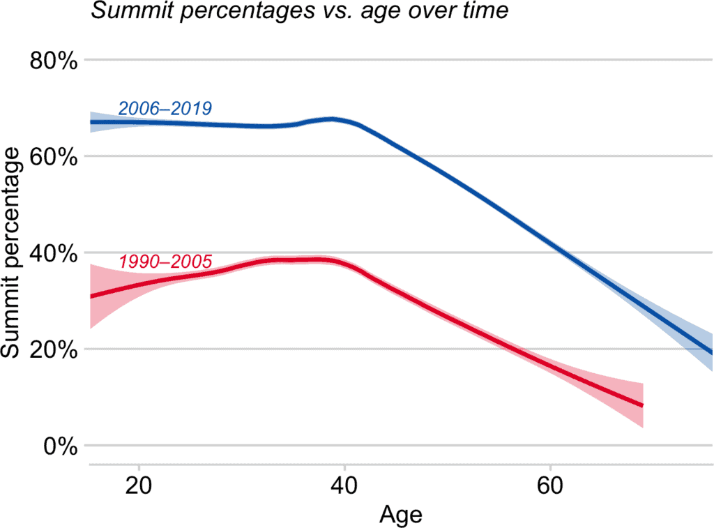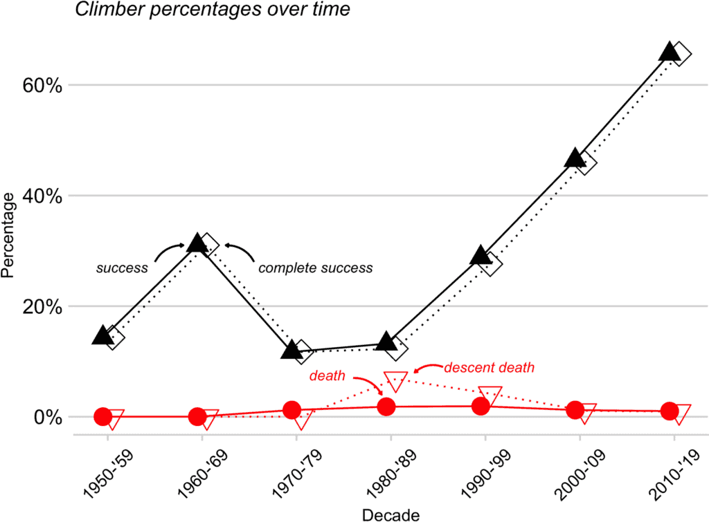 Currently, two out of every three climbers succeed on Everest. The study reveals that summit success rates have significantly improved over the past two decades. From 1990 to 2005, 32.8% of climbers reached the summit. This figure doubled between 2006 and 2019, with 66.5% achieving the summit. The reasons behind the improvement include better weather forecasting, presence of fixed ropes on much of the route, accumulated logistic and route experience, improved oxygen equipment, and shifts in oxygen use.