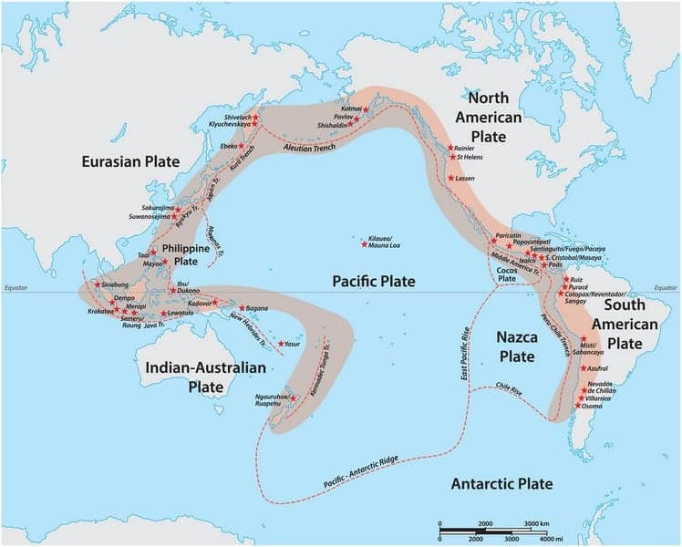 The Ring of Fire hosts over 75% of the world’s active and dormant volcanoes and approximately 90% of the world’s earthquakes occur, making it the most seismically active region on Earth.