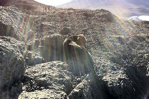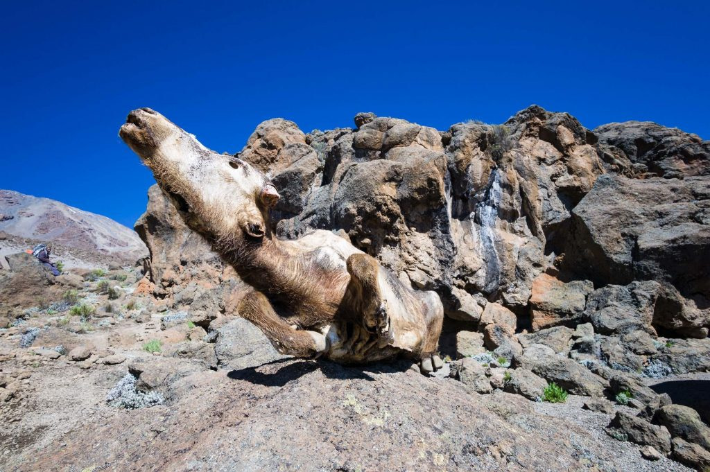 Buffalo will occasionally venture into the higher regions of the mountain. They are drawn to the salt and other minerals on the rocks. Unfortunately, around 2009, this buffalo got lodged between boulders and eventually starved to death. When discovered by local porters, the body was very much intact and well preserved.