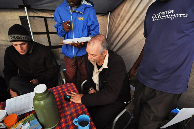 The guides will also perform twice daily health checks (each morning and night) in the mess tent. With a pulse oximeter, they will take oxygen saturation readings from every climber. At the same time, they ask a set of questions known as the Lake Louise Scoring System. The oxygen readings and questionnaire responses are logged to evaluate changes in your acclimatization.