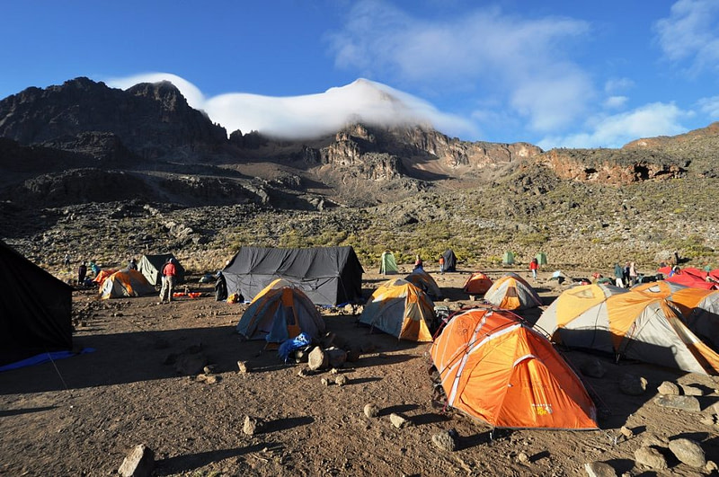 You’ve spent the past six hours hiking along Mount Kilimanjaro’s well established trails. And coming over a ridge, you see a sea of color in the distance – tents.