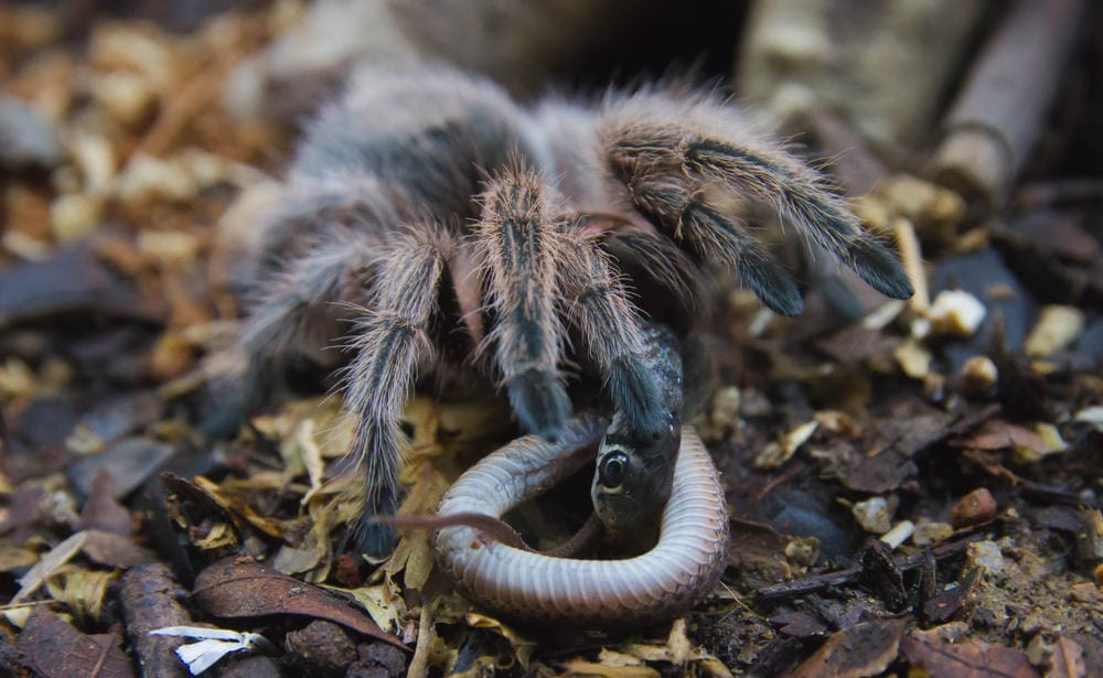 • Tarantulas: Large tarantulas have been observed preying on snakes. Their big bodies and strong venoms make them capable of taking on snakes that are manageable in size.