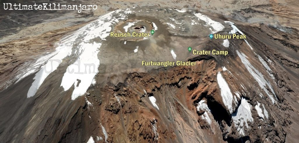 Just shy of the summit, there is a little used campsite known as Crater Camp (18,800 feet/5,750 m). It is called Crater Camp because it is a short distance from the source of Kilimanjaro herself, Reusch Crater (19,140 ft/5,800 m). Additionally, the campsite is next to one of Kilimanjaro’s last remaining glaciers, Furtwangler Glacier. Staying at Crater Camp gives climbers an opportunity to climb to the crater rim, and to get up close to the glaciers.