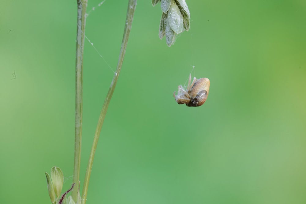 The Bird-Dropping Spider is an example of mimesis. It disguises itself as a lump of bird feces. Its curved abdomen and mottled coloration look like bird droppings on leaves or bark.