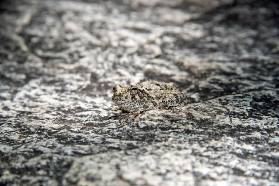 This Canyon Tree Frog blends almost perfectly with its landscape. Its mottled gray and brown skin looks nearly identical to the rocks where it lives. Additionally, its warty texture mimics the rough feel of canyon rock.