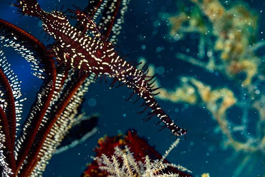 Ghost Pipefish are stunning examples of camouflage. With an ethereal appearance, they remain hidden in the seagrass and coral habitats they occupy. Native to the Indo-Pacific region, ghost pipefish have elongated bodies, translucent skin, and leaf-like appendages. Their coloration can vary from pale greens to muted browns. They even possess the ability to change their coloration to some extent.