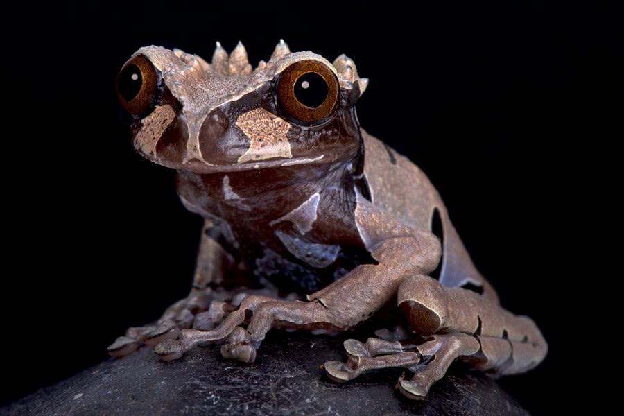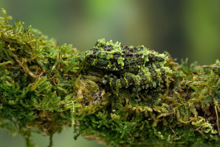 Mossy Frogs are native to the mountainous regions of Vietnam, Laos, and China. These amphibians have skin with large, glandular protrusions that resemble moss, lichen, and other foliage. Their green coloration is often speckled with browns and yellows. The Mossy Frog often remains motionless for extended periods, minimizing movement that could reveal its presence. When threatened, the frog can puff up its body and extend its limbs to further obscure its outline.