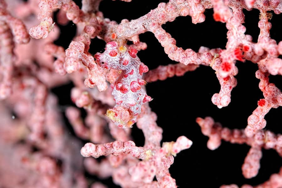 Pygmy Seahorses are tiny creatures that measure about 1 inch (2.5 cm) in length. They live on sea fans and soft corals across the Indo-Pacific. Their skin sports tiny bumps and colorations that match the coral’s form and shade. Pygmy Seahorses stay camouflaged among coral polyps, leaving them nearly invisible on a busy reef, and feed on small crustaceans, plankton, and coral.