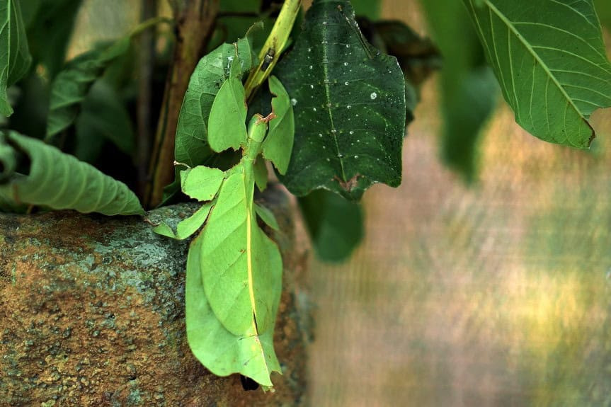 Leaf Insects live in the tropical forests of Southeast Asia, Australia, and the Pacific Islands. These insects have body shapes and wing structures that are incredibly similar to the shape, color, and texture of actual leaves. They can have varying shades of color from greens to browns and yellows to replicate dead or decaying leaves, providing effective camouflage across different seasons and stages of plant life. They also synchronize their movements with the surrounding vegetation to avoid detection.