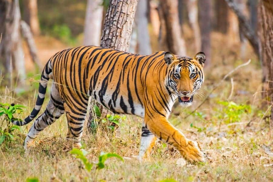 The distinctive black stripes of a tiger’s coat are a great example of disruptive coloration. The contrast of the dark stripes against the orange background breaks up the animal’s silhouette. This works in part because deer, the primary prey of tigers, have a limited ability to distinguish between the color of a tiger’s orange fur and the surrounding green foliage.