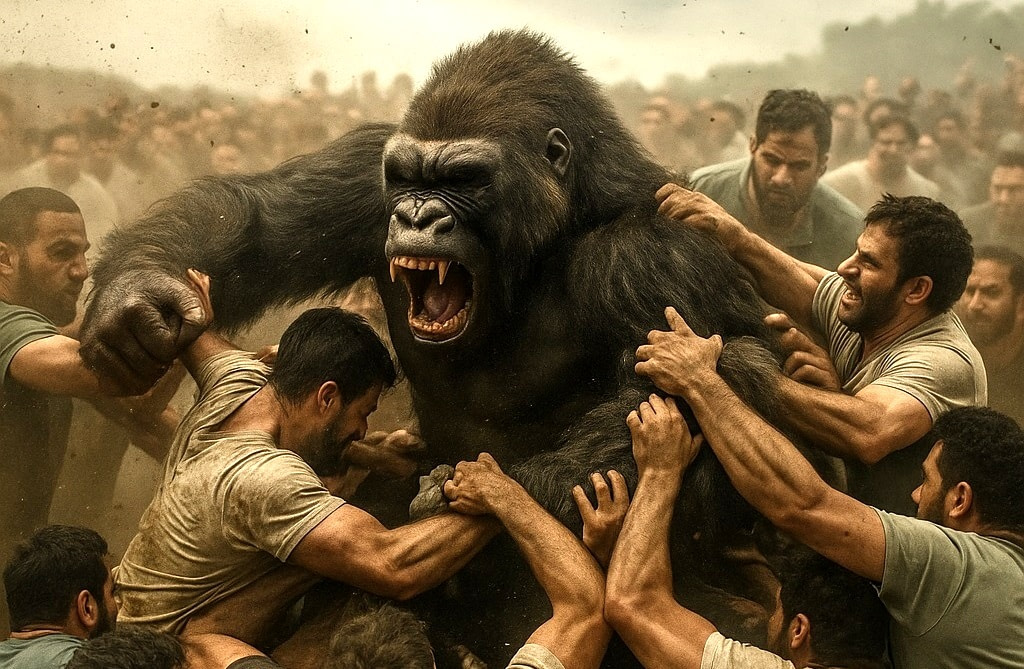 Once grounded, the fight tilts. The gorilla’s strength becomes less useful. Even a silverback can’t throw off a dozen people at once, especially if they’re anchored to its legs or pulling it to the ground. The pressure mounts. Its chest can’t expand. It struggles to breathe. Exhaustion sets in.
