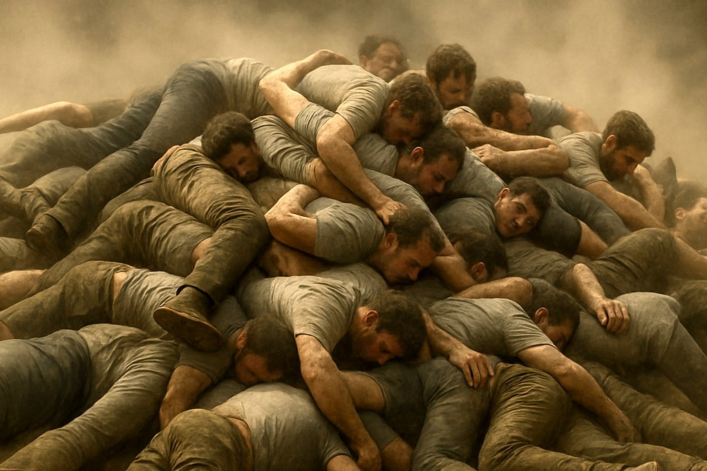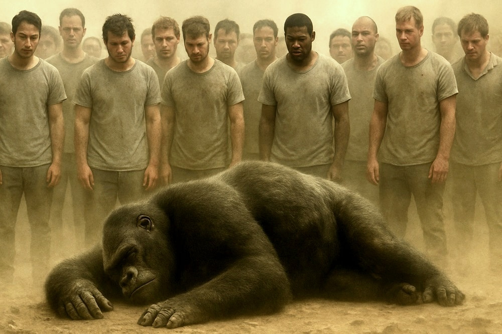 By the three to five-minute mark, the gorilla is likely overwhelmed—partially restrained, buried under bodies and breathing heavily. From here, the finish is inevitable. Some men press knees and forearms against the throat. Others smother the face or block the nose and mouth. The gorilla shuts down under the crush of human bodies. It’s asphyxiation by body weight. Some men toward the bottom of the pile may also suffocate.