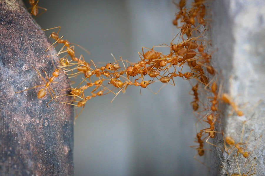 Ants form colonies that can exceed hundreds of thousands of workers. Each ant reacts to local chemical or tactile cues. Foraging ants lay pheromone trails that guide others to food. Small changes in these trails can lead to big gains in gathering efficiency. Ants even form living bridges by linking their bodies to cross gaps.