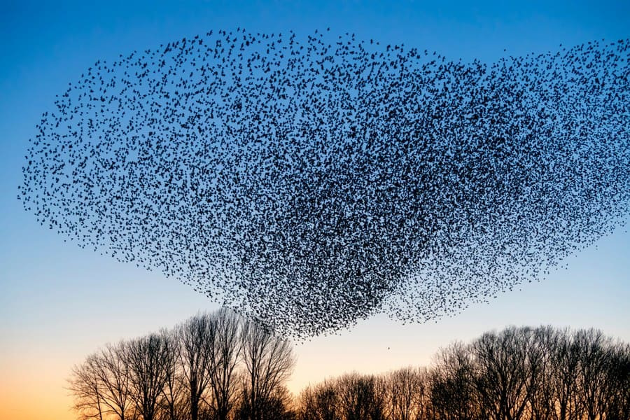 Starlings gather in huge flocks called murmurations. Thousands of birds shift direction in near-perfect unison. Experts note that each starling tracks a small number of neighbors to match speed and angle. These local interactions generate a swirling cloud that evades predators like hawks.
