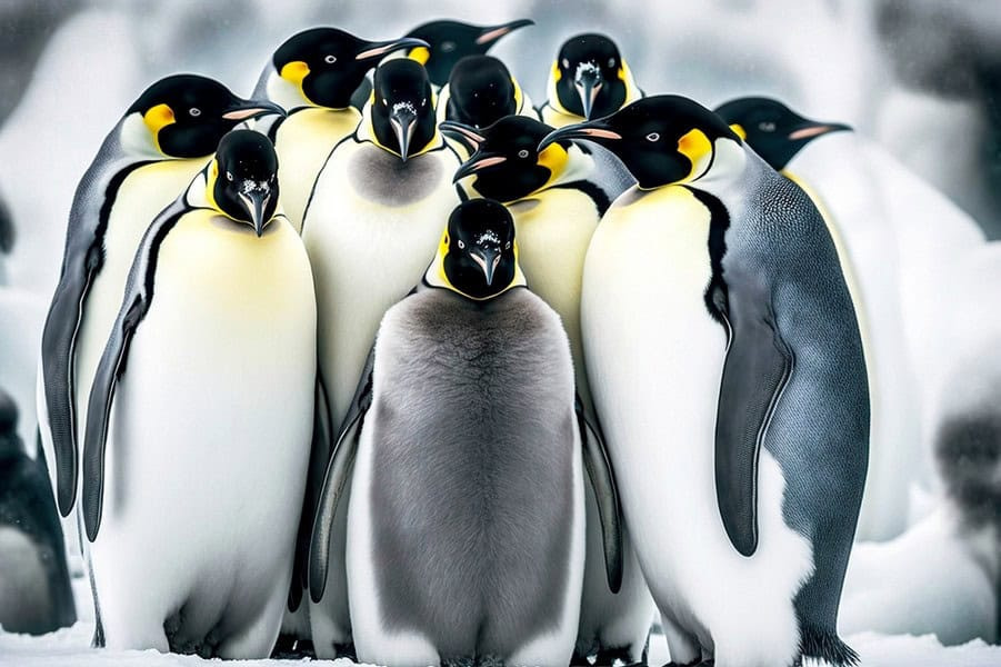 Emperor penguins face extreme polar cold. They huddle together in large groups, pressing close to share warmth. Individuals on the outside gradually rotate inward. This slow ripple of motion spreads through the cluster, allowing each penguin a chance to escape the wind.