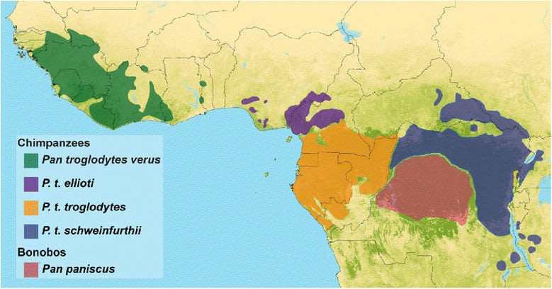There are four recognized sub-species of chimpanzee: eastern chimpanzee (P. troglodytes schweinfurthii found in East Africa), western chimpanzee (P. troglodytes verus found in West Africa), central chimpanzee (Pan troglodytes troglodytes found in Cameroon and Congo), and Nigeria-Cameroon chimpanzee (P. troglodytes ellioti found in Nigeria and Cameroon).