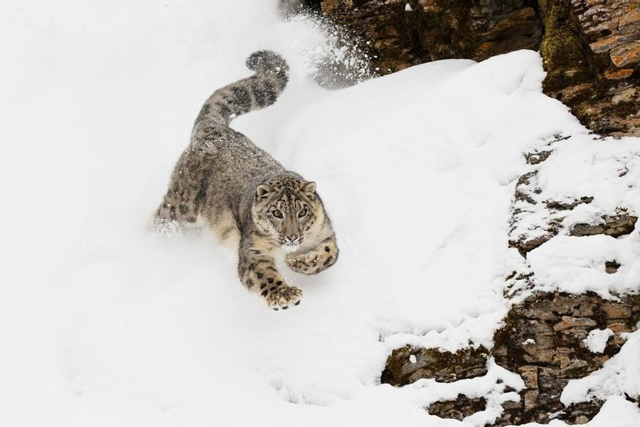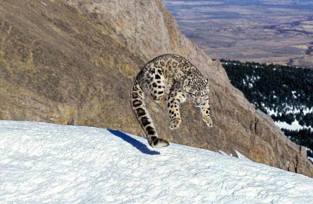 Snow leopards can leap six times the length of their body, making them one of the most impressive jumpers in the animal kingdom. A typical snow leopard can jump as far as 50 feet (15 meters) horizontally and about 20 feet (6 meters) vertically. This leaping capability is important for navigating the steep and broken terrain of their alpine home. Their long, flexible bodies and powerful hind legs give them the explosive power necessary for these jumps. Additionally, their long, thick tails aid in balancing and steering mid-air during these high leaps.