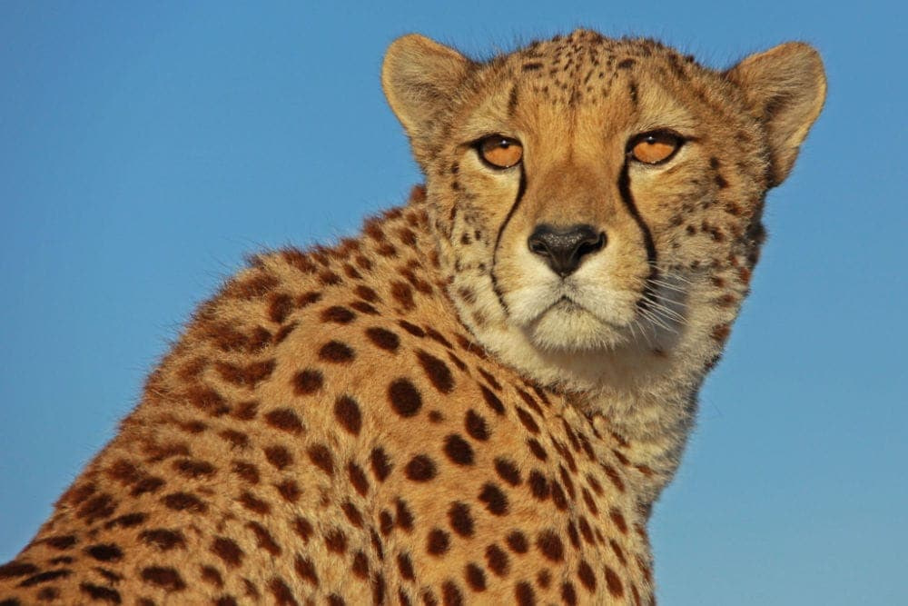 The answer is staring you right in the face! Cheetahs have long, black lines that run down their face from their eyes to their mouth, called “malar stripes” or “malar marks. Malar marks are an adaptation for deflecting the brightest sunlight off the horizon or the wide-open savannas, allowing them to see better in the daylight. They help the cheetah focus on their prey when they are hunting.