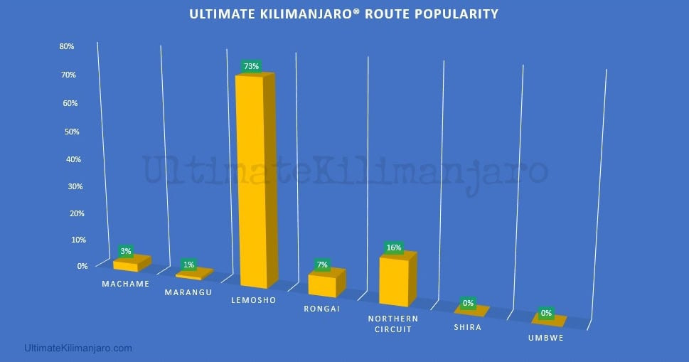Ultimate Kilimanjaro® clients use Lemosho (73%), Northern (16%), Rongai (7%), Machame (3%) and Marangu (1%).