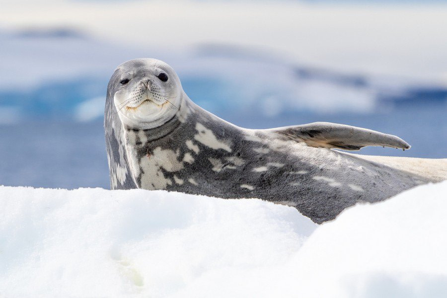 Leopard Seals, named for their spotted coats, are fearsome predators in the Antarctic ecosystem. As the third-largest seal species in Antarctica, they can reach lengths of up to 12 feet (3.65 meters) and weigh as much as 1,300 pounds (590 kg). Their slender bodies and powerful jaws equipped with large, sharp teeth make them adept hunters, preying on a variety of species including fish, squid, penguins, and even smaller seals. Leopard Seals are solitary creatures, often found patrolling the edges of ice floes in search of their next meal.